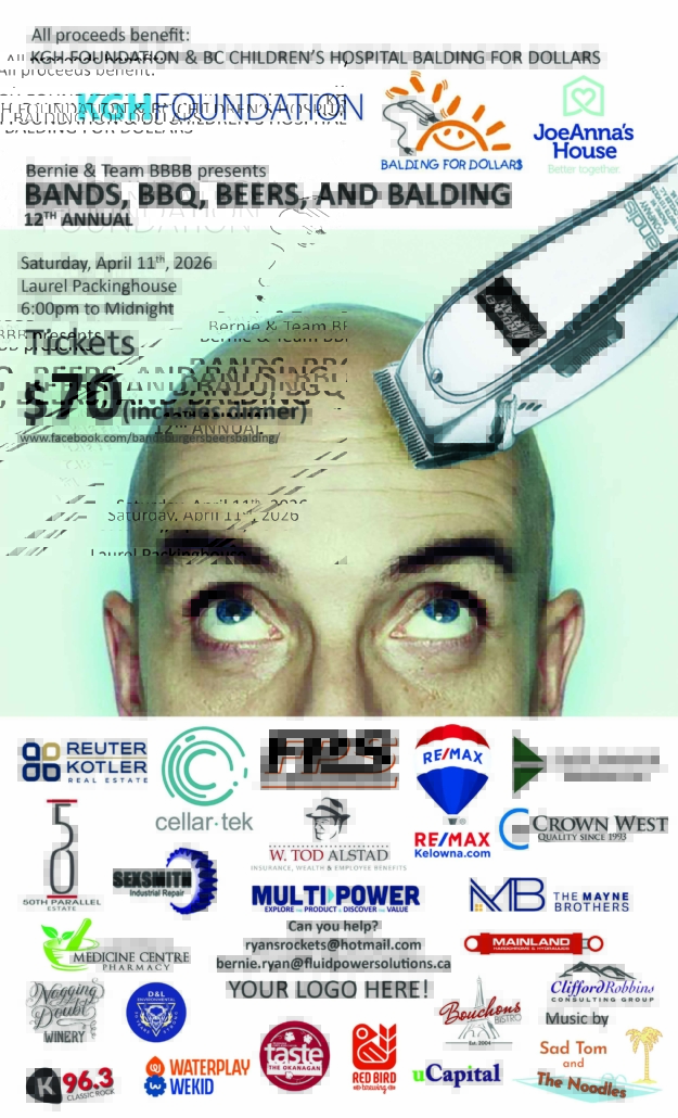 Bands, BBQ, Beers, and Balding is back for its 12th annual iteration, and will again raise funds for JoeAnna’s House and the BC Children’s Hospital!